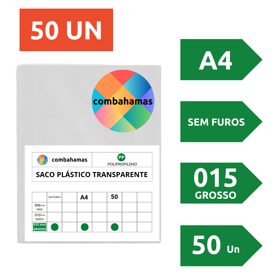 ENVELOPE PLÁSTICO, PP, A4, 23,5 X 30 X 015, GROSSO, SEM FUROS, 50 UN